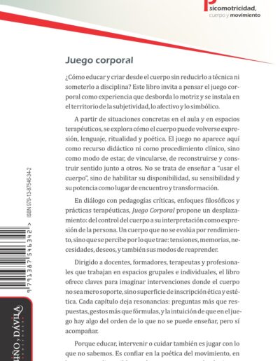 Dirigido a docentes, formadores, terapeutas y profesionales que trabajan en espacios grupales e individuales, el libro ofrece claves para imaginar intervenciones donde el cuerpo no sea mero soporte, sino superficie de inscripción ética y estética. Cada capítulo deja resonancias: preguntas más que respuestas, gestos más que fórmulas, y la intuición de que en el juego hay algo del orden de lo que no se puede enseñar, pero sí acompañar.