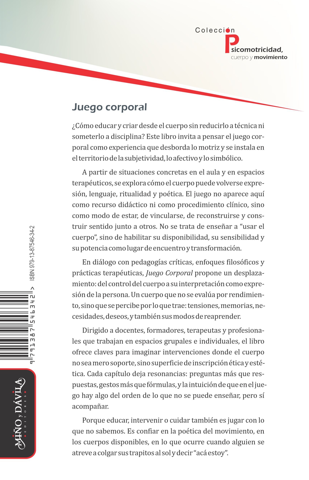 Este libro recorre prácticas educativas y terapéuticas que habilitan al cuerpo como lugar de encuentro, expresión y transformación. A través del juego, se propone una mirada que excede lo motriz y se inscribe en lo afectivo, lo simbólico y lo vincular. Dirigido a docentes, terapeutas y formadores, ofrece herramientas para acompañar procesos donde el cuerpo no se evalúa, sino se escucha, se mueve y se vuelve poética compartida.