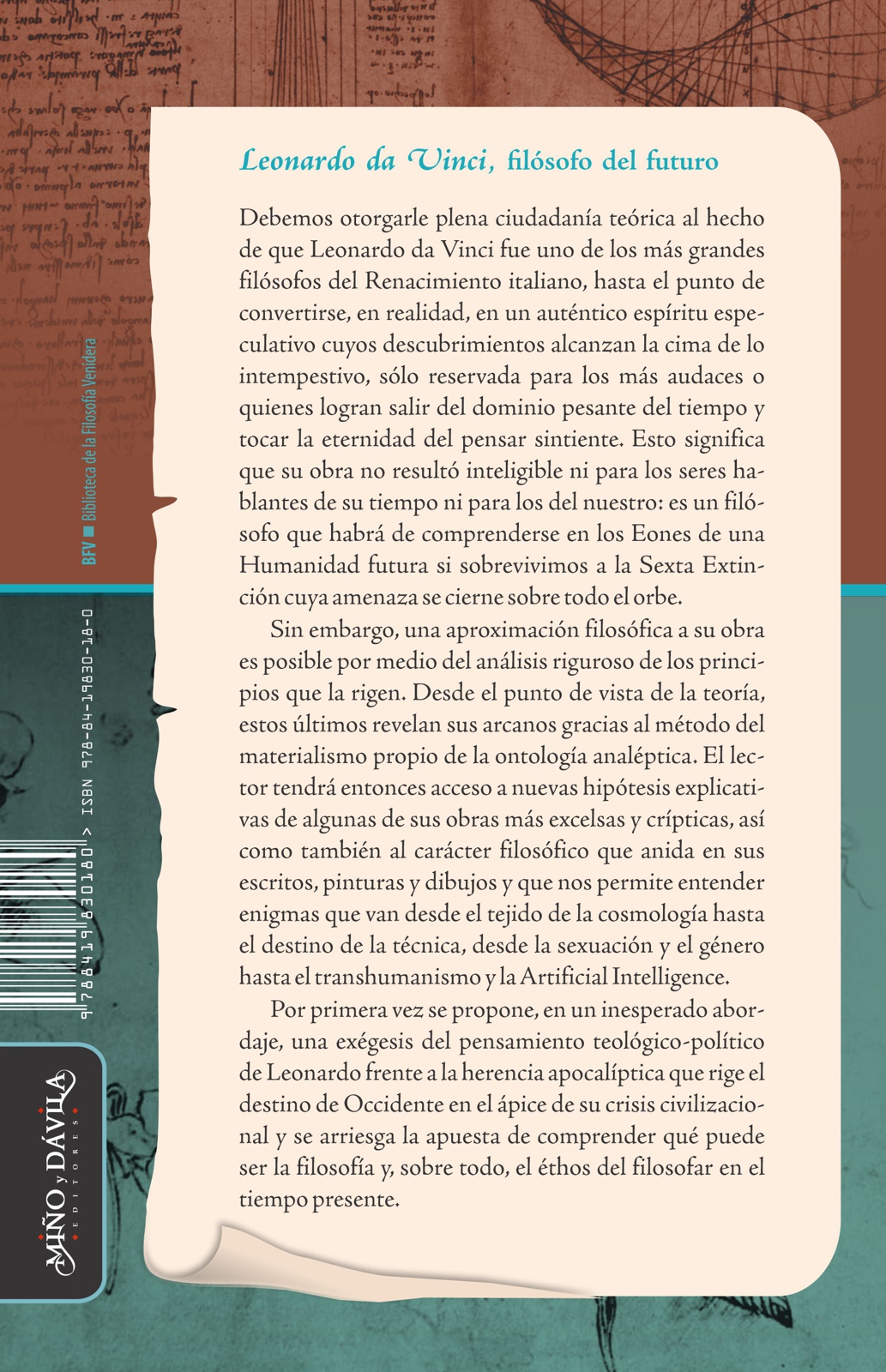 Por primera vez se propone, en un inesperado abordaje, una exégesis del pensamiento teológico-político de Leonardo frente a la herencia apocalíptica que rige el destino de Occidente en el ápice de su crisis civilizacional y se arriesga la apuesta de comprender qué puede ser la filosofía y, sobre todo, el éthos del filosofar en el tiempo presente.